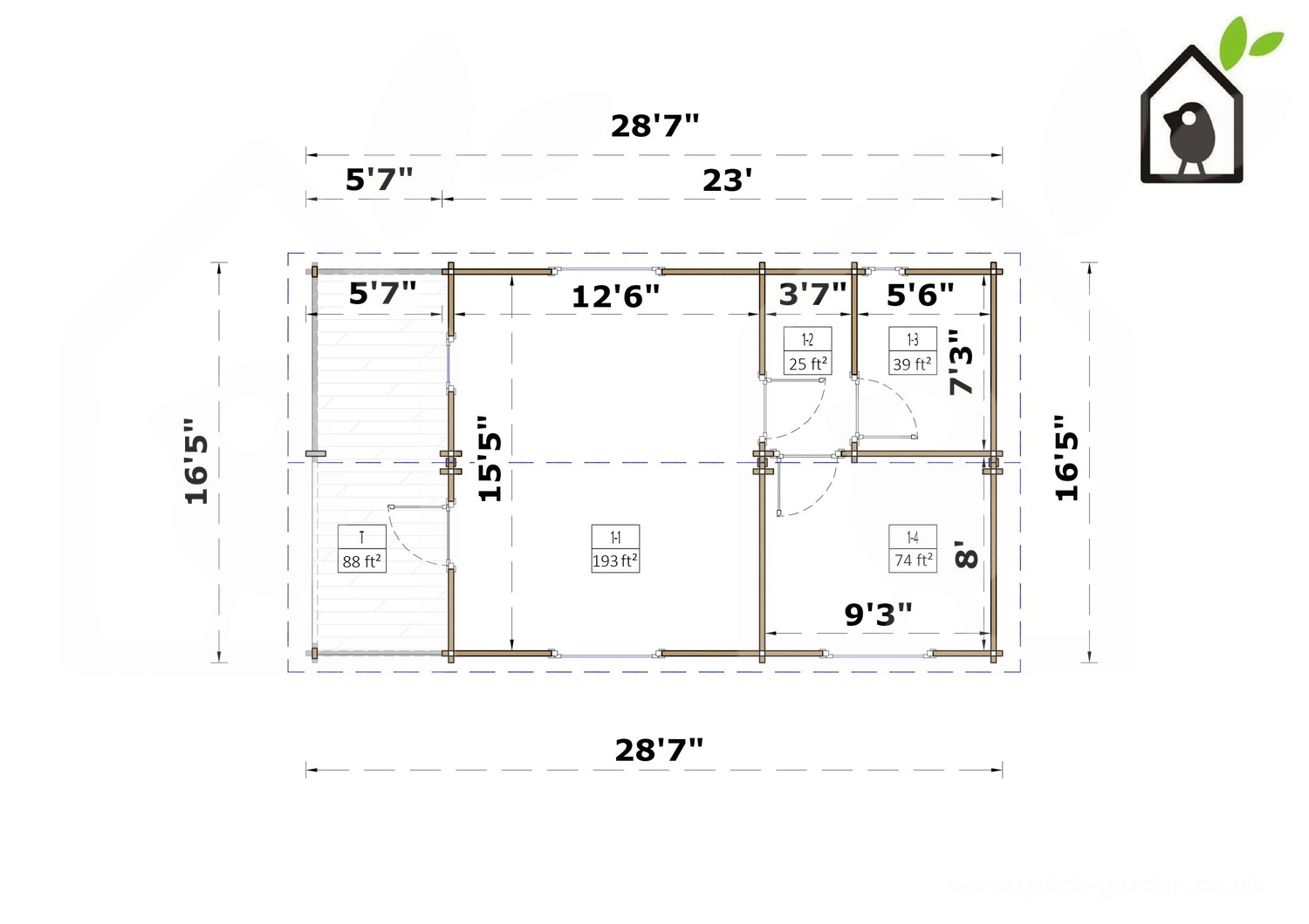 | External dimensions (width x depth) | 16'5" x 28'7" |