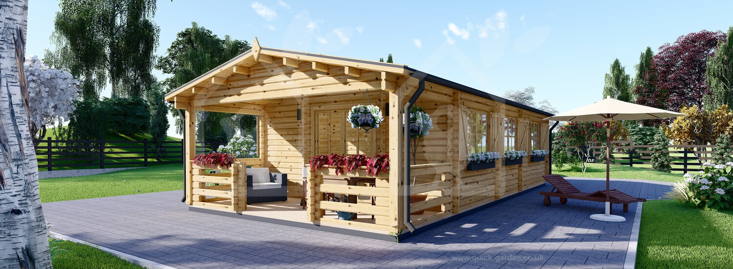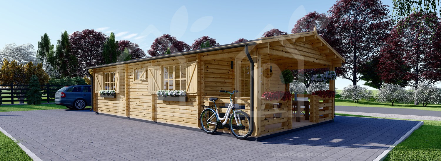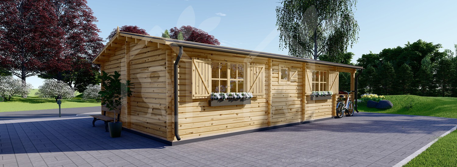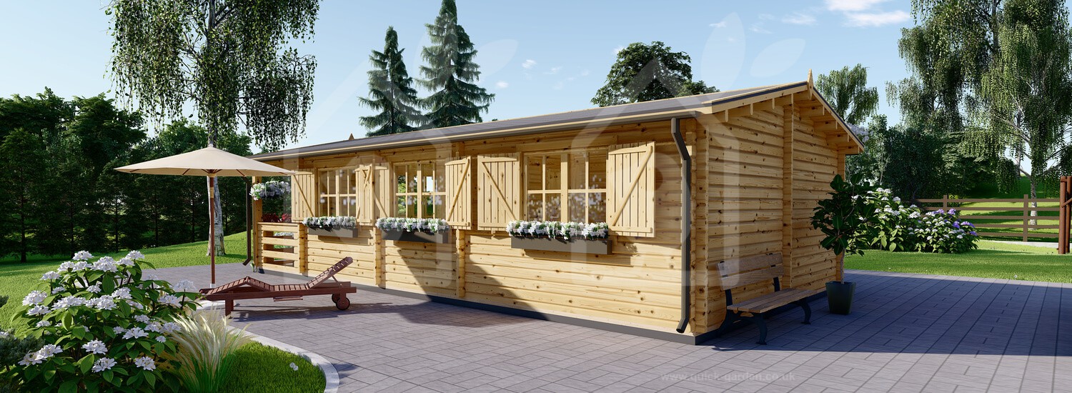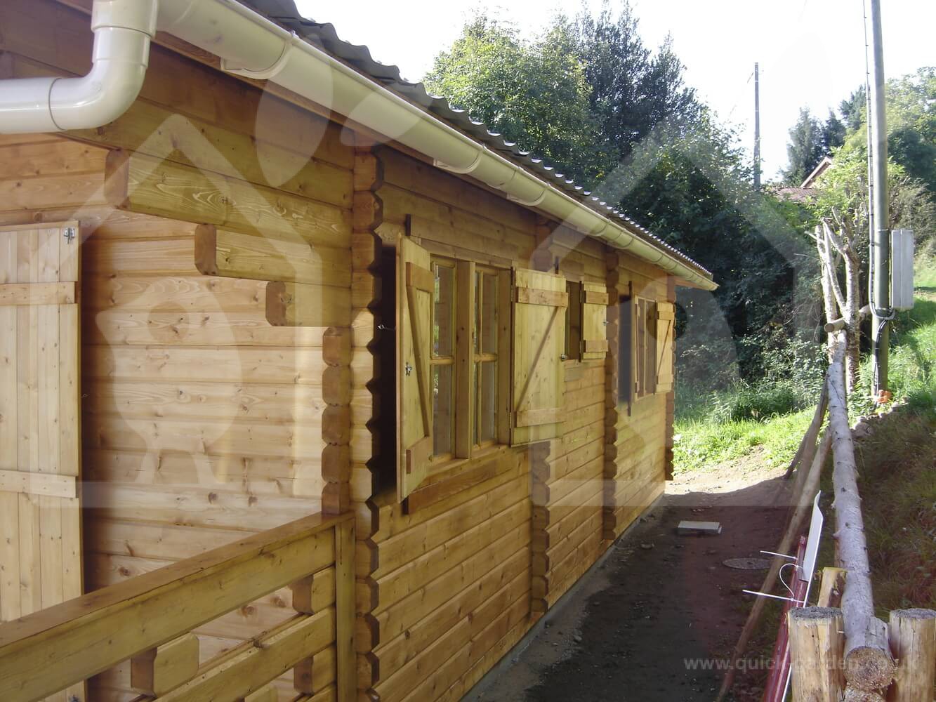 The 17 X 27 Hymer log cabin has extra thick 2.6” walls formed from Scandinavian conifer wood that provide exceptional insulation. That is almost an inch thicker than standard. The roof and floor boarding is all 0.8” for a consistent finish. Thanks to the high-density timber, each piece of wood has an anti-rot guarantee covering 10 years. With double-glazed windows that feature wooden shutters, the Hymer log cabin’s look and quality are divine.