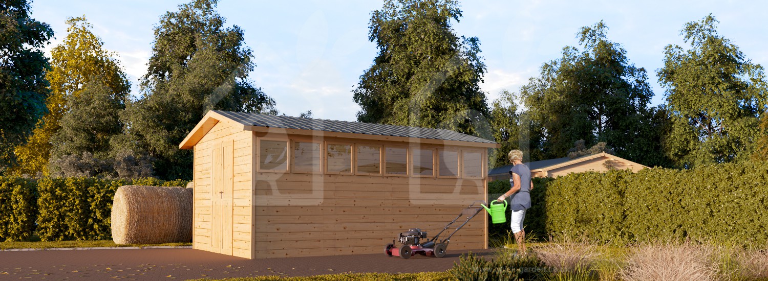 A wonderful shed to keep you busy from dawn till dusk. The Kappa wooden shed provides ample space for numerous uses thanks to its unique shape. Put a workshop at one end and a home gym at the other, or storage on one side and an art studio at the other. With wide windows, natural light fills the full length of the space. The central entrance has heavy duty double doors that open wide enough to fit just about anything. Use the Kappa shed for multiple purposes, and it will meet your needs every time.